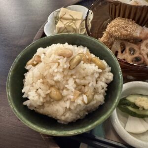 限定数のあめつち養生ごはんは、玄米や炊き込みご飯、小鉢の数々で心もお腹も満たされる内容。
