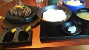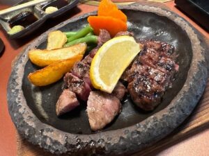 - 炭火焼ステーキ定食(150〜200g)×2+子ども取り分け(足りなければハンバーグ200gを追加)。