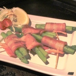 - 提供早めの一品… アスパラベーコンなど鉄板つまみは先出しで。
