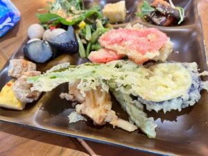 揚げたての野菜天ぷらと優しい惣菜、仕上げのカレーまで“野菜が主役”のビュッフェです。