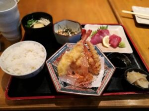 | 大人2+幼児1(3人) | すき焼き定食(¥880)+天ぷら+お造り定食(¥880)+出し巻き(¥400)+アイス(¥200) | 約¥2,360 |