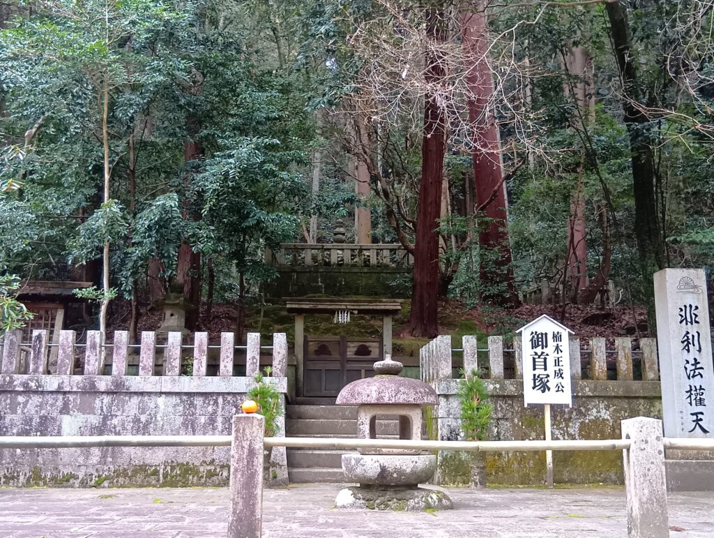 境内の奥にある楠木正成の首塚は、南北朝史を象徴する静謐な場所。