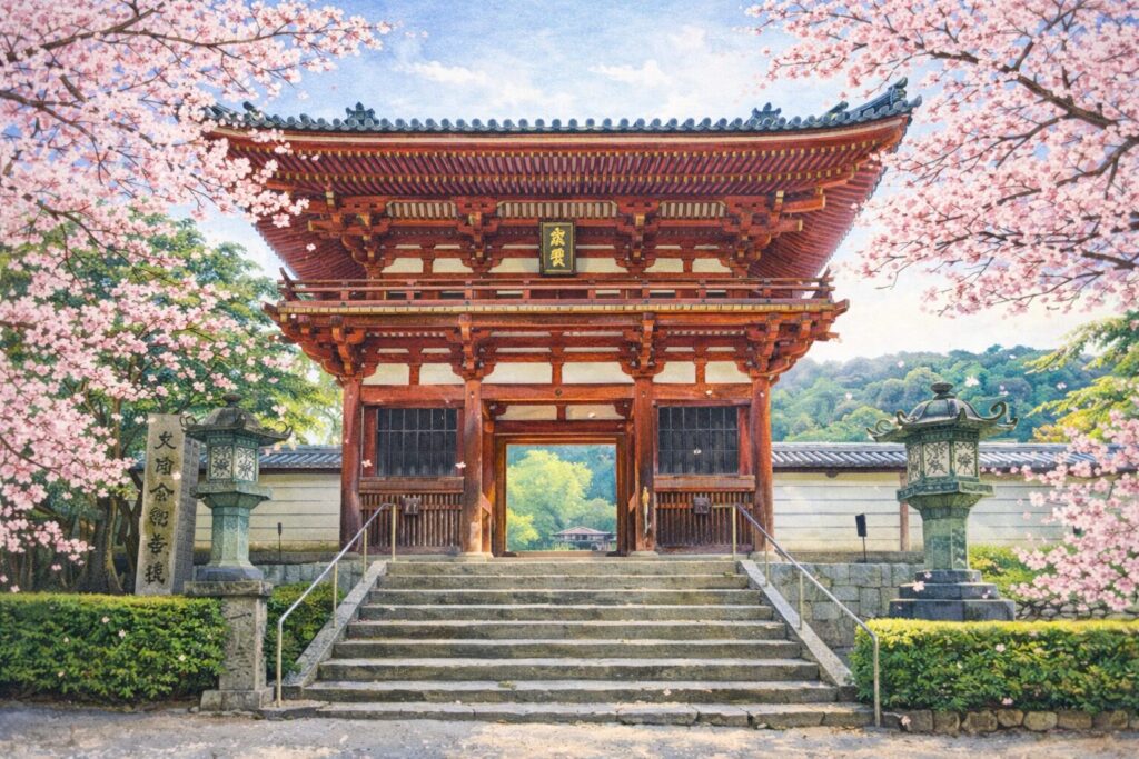 重要文化財の金堂を背景に桜を撮ると、歴史と花の両方が伝わる写真になります。光の方向を意識して、桜>建物全体のバランスを整えると見栄えがグンと上がります。