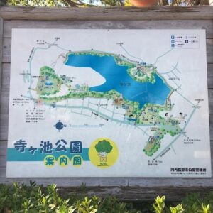 園内は池をぐるっと囲む形でエリアが広がり、管理事務所側には広場や案内板がまとまっています。