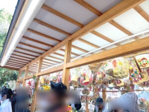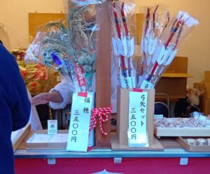 巫女さんや神職さんが並び、多くの参拝者が福笹や縁起物を選んでいました。