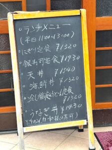 | 銀寿司定食 | 1,430円 | 天ぷら/お造り/小鉢/サラダ/漬物/ご飯/お吸い物付きで紹介あり。 |