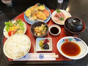 - 銀寿司定食の内容が豪華(天ぷら・お造り・小鉢などが付く紹介)。