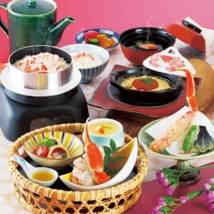 | かにすき膳 つどい | かに籠盛+かにすき小鍋+焼かに+かに寿司+吸物 | 5,830円 | 小鍋は取り分けしやすい反面、火元は要注意 |