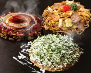 名物のふわふわオムそば風お好み焼き「わらい焼」と、ソースいらずの塩お好み焼き「京天焼」は、大人も子どももパクパク食べ進んでしまう看板メニュー。