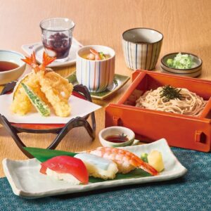 - 大人:ざるそば(二段)お好みランチ(1,100円)(ミニ丼or寿司が選べるタイプの案内あり)