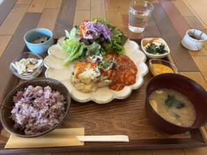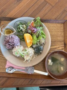 - やさしい手作りランチ:地元野菜や黒米ごはん、出汁から取った味噌汁など“体にやさしい”が詰まった定番セット。