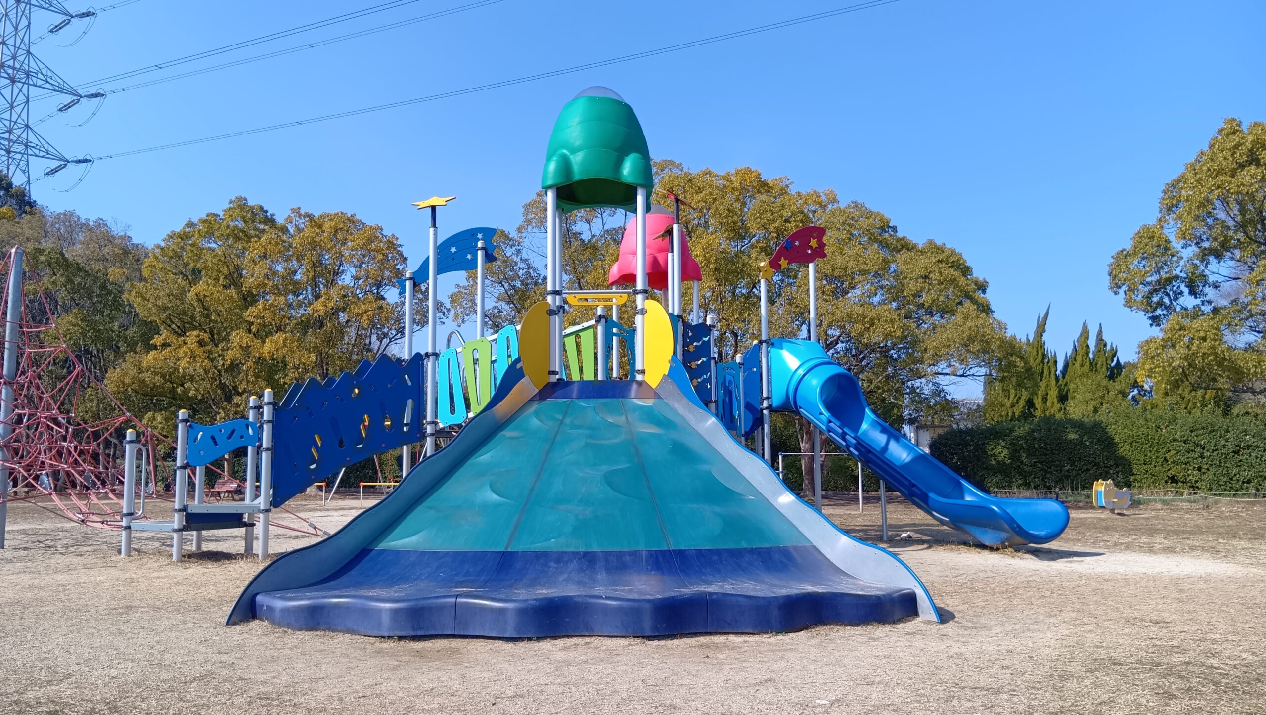 広々とした公園には迫力満点の大型すべり台があり、3歳の子どもでもチャレンジしやすい傾斜になっています。