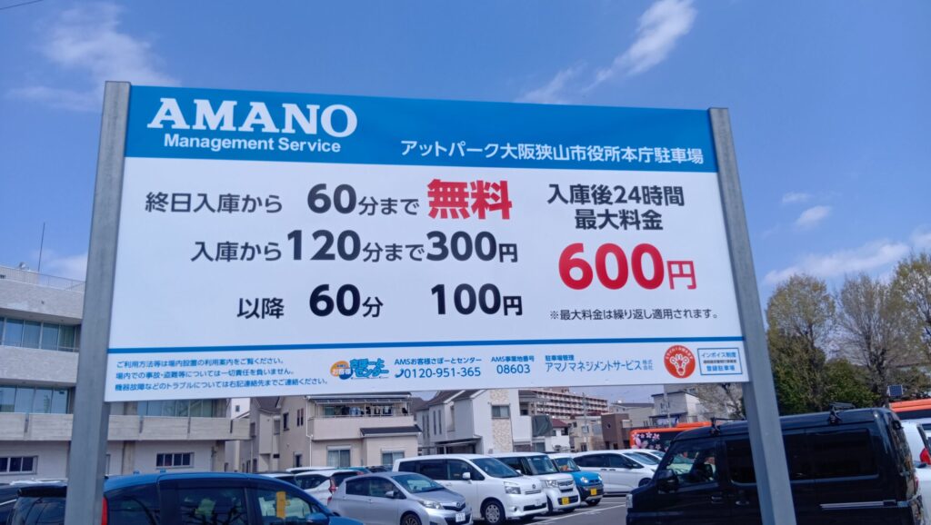 | アットパーク大阪狭山市役所本庁舎駐車場 | 最初の60分無料 | 24時間最大600円 | - | ★★★★★ | 市役所の用事、短時間利用、子連れ移動 |