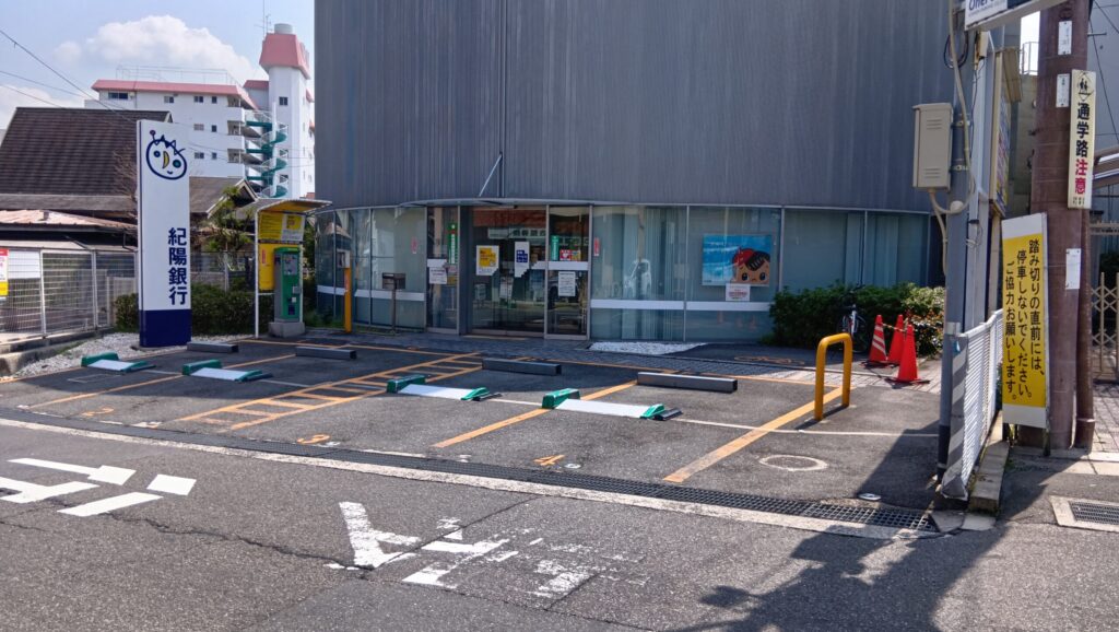 紀陽銀行の店舗前にあるため、銀行利用や短時間の立ち寄りには使いやすい位置です。踏切側よりも目的地によってはこちらの方が寄りやすいこともあり、駅前でサッと停めたいときの選択肢として覚えておくと便利です。こちらも周辺道路の流れを見ながら、東向き一方通行を意識して向かうと入りやすいです。