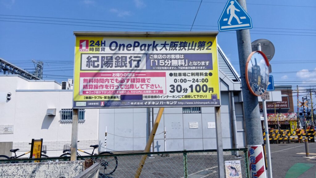 | OnePark大阪狭山第1(紀陽銀行前) | 30分100円 | 最大料金なし | 4台 | ★★★☆☆ | 銀行ATM、駅送迎、短時間利用 |