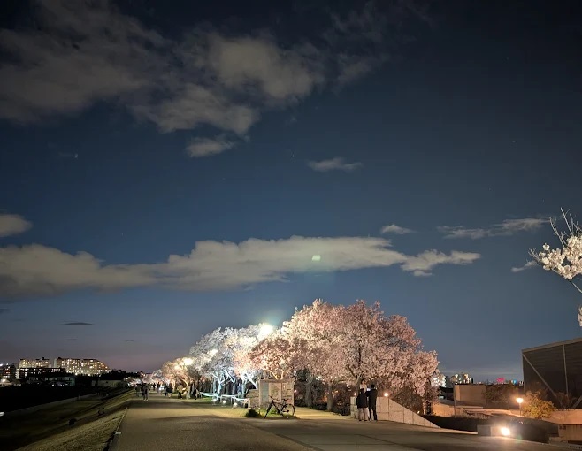昼の開放感ある景色とは違い、夜は桜がやわらかく浮かび上がる、しっとりした雰囲気を楽しめます。