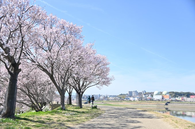 早咲きのコシノヒガンを中心に、水辺の開放感と桜並木を一緒に楽しめるのが、ほかの花見スポットにはない魅力です。