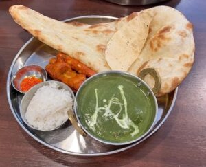 Bランチ | サラダ/パーパド/ライス/チキンティッカ1P/シークカバブ1P/カレー1種(例:エビ、チキンほうれん草 等)+ナン+ドリンク | ¥1,100 |