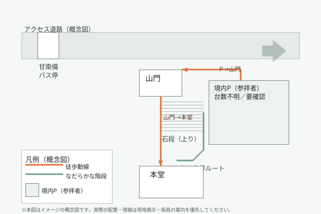- 車:境内に駐車場あり(台数不明/要確認)。繁忙期は駅周辺の時間貸Pをセカンドに。